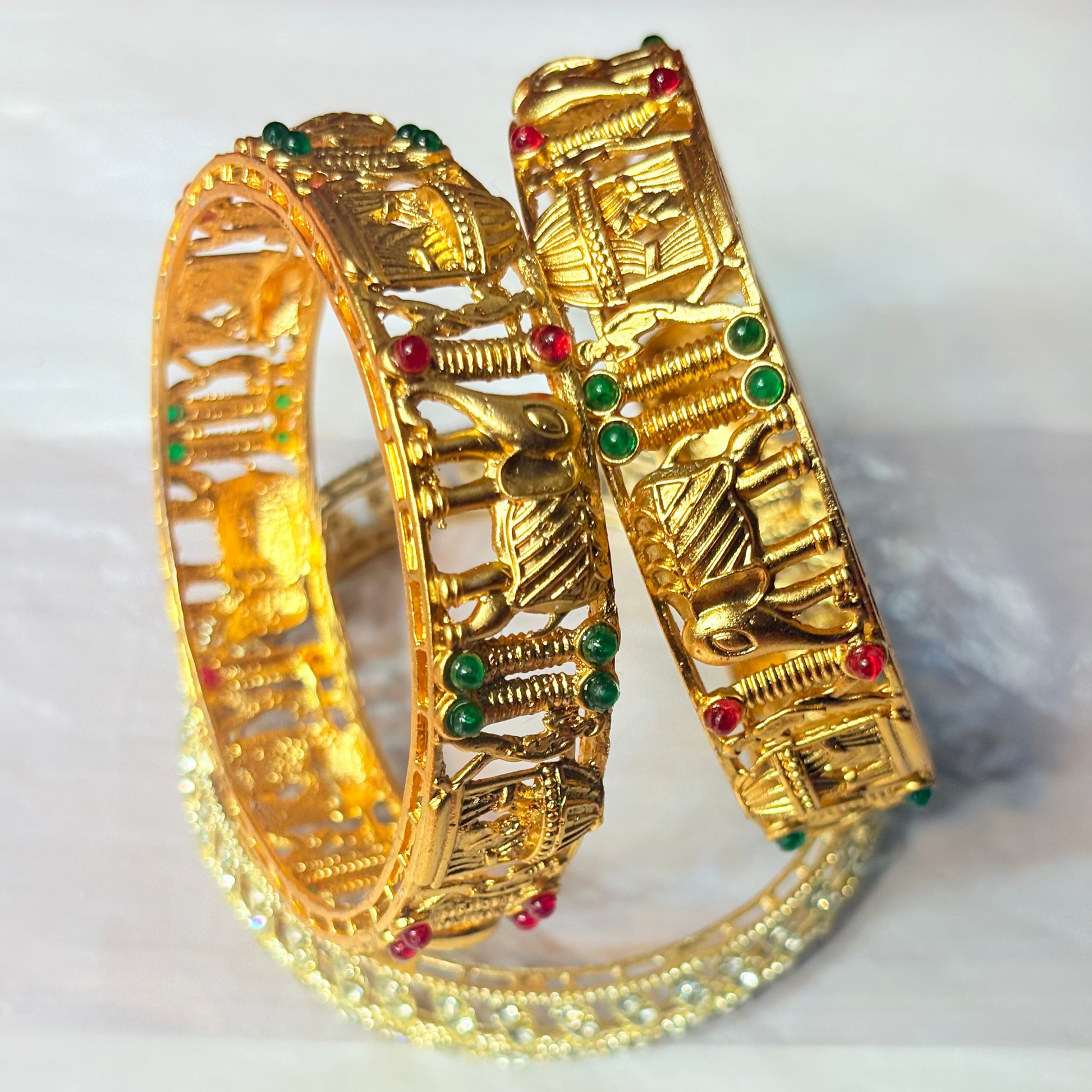 Celebrate the elegance of tradition with the Ancient Glory Kada, a masterpiece inspired by royal heritage and temple artistry. Crafted in a luxurious golden finish and adorned with red & green accents, these kada bangles bring the perfect blend of cultural charm and majestic beauty.