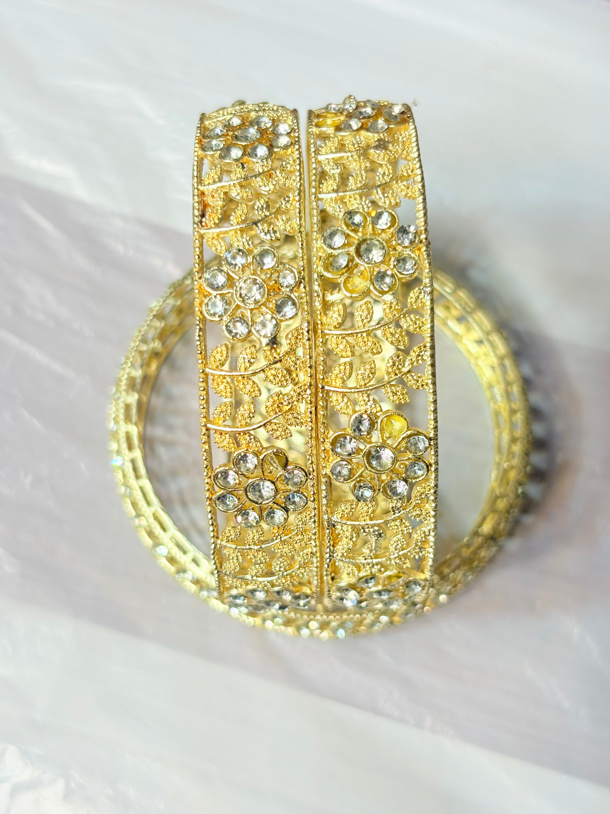 Add a touch of sparkle to your wrists with our Crystal Bloom Bangles, beautifully crafted in a silver-tone finish and adorned with shimmering floral stonework. The delicate blooms, set with glistening crystals, catch the light with every movement, making them perfect for festive occasions, weddings, and special evenings.