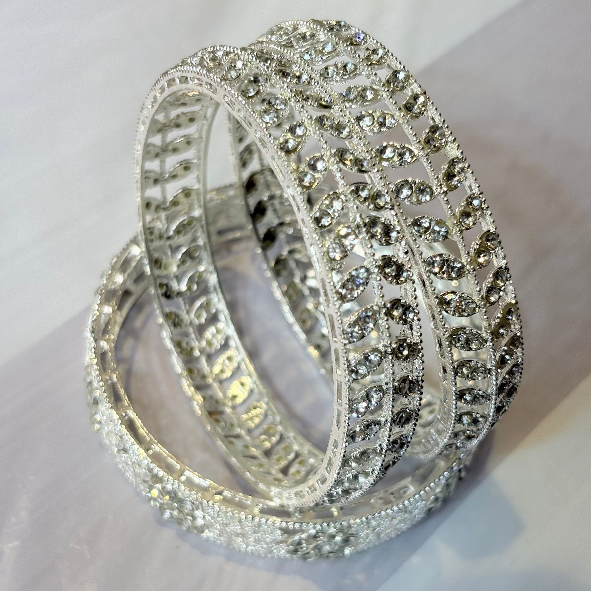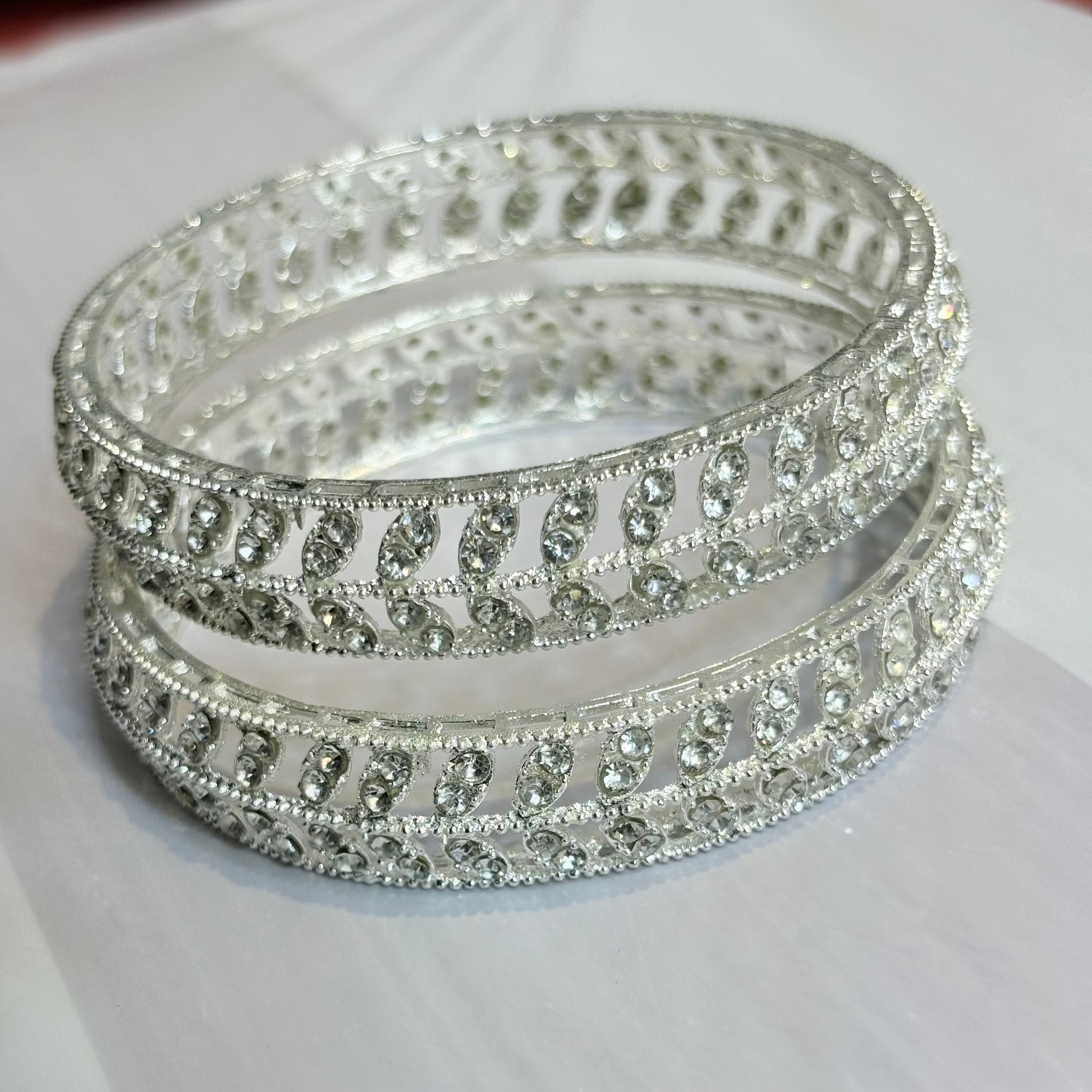 Add a touch of luxury to your look with our Silver Leaf Design Kada Bangles, crafted with intricate leaf patterns and sparkling stones that reflect grace from every angle.